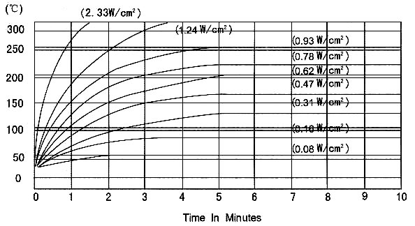 這個(gè)圖闡述了當(dāng)加熱器未絕緣且垂直置于20℃的靜止空氣中時(shí),一個(gè)硅橡膠加熱器達(dá)到的表面溫度。這個(gè)數(shù)據(jù)是基于1.4mm厚的標(biāo)準(zhǔn)結(jié)構(gòu)并作為參考工具提供。