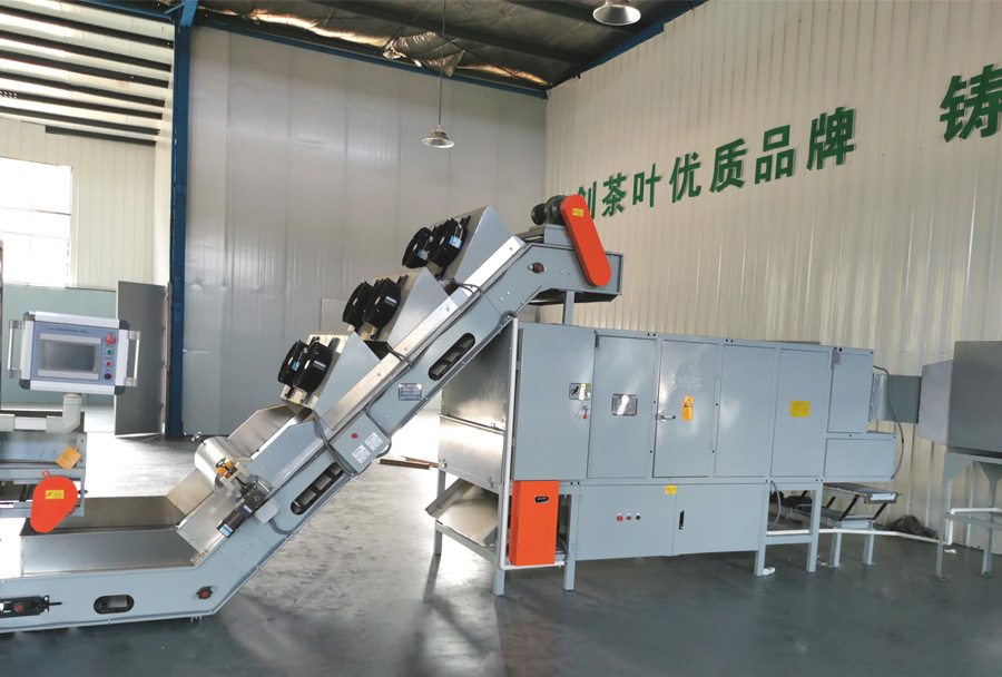 作業原理:機組采用搭接式結構,上料裝置與烘干箱體獨立,在防止漏茶的同時也減輕烘干機負載;采用臺灣輕型鏈條及雙滾輪、雙卷邊翻板,減少漏茶、夾茶 且降低運行噪音;等寬輸送使上料厚度更均勻;烘干箱體采用矩形管設計及石棉保溫處理,保證了烘箱四周的烘干溫度。